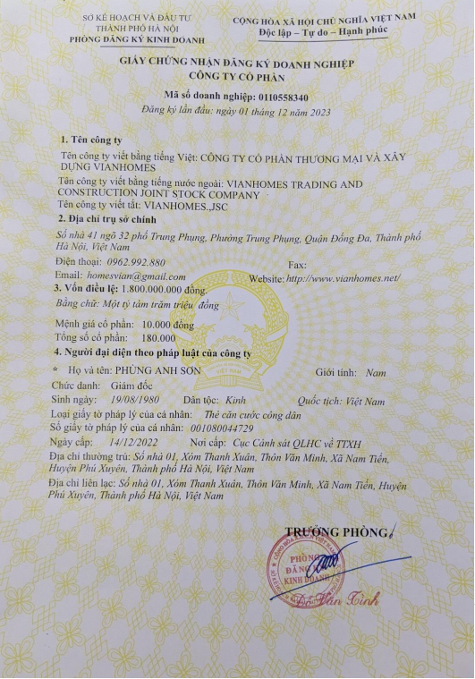 Tên công ty: CÔNG TY CỔ PHẦN THƯƠNG MẠI VÀ XÂY DỰNG VIANHOMES